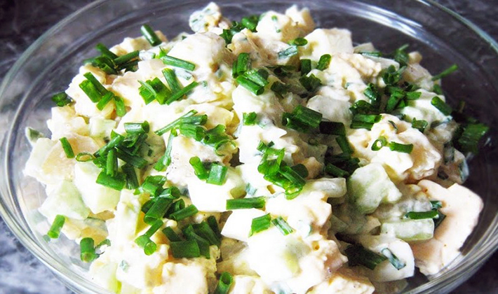 - Ajouter la salade, mélanger, mettre dans un saladier et réfrigérer pendant 2-3 heures avant de servir.