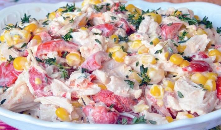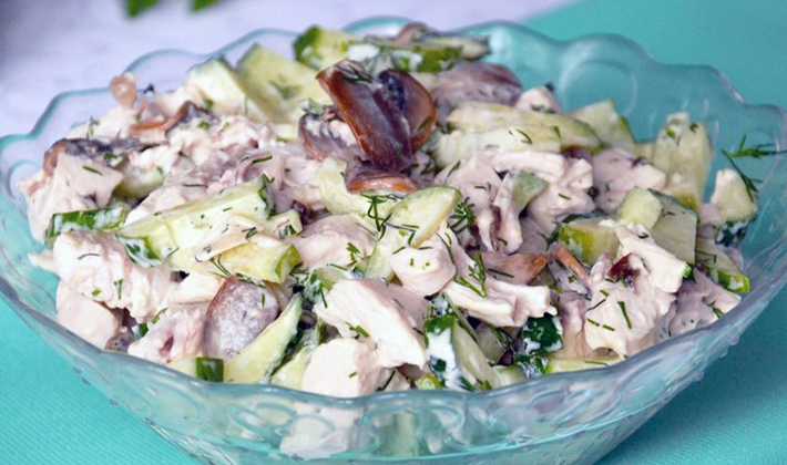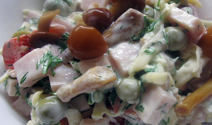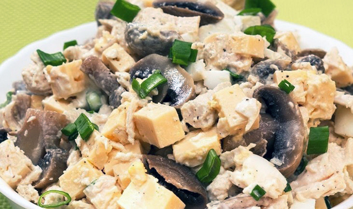 La salade faite avec du poulet, des champignons en conserve et du fromage ne peut pas aimer.