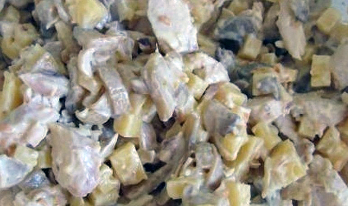 - Peler les pommes de terre, les œufs, les oignons, les couper en petits morceaux et les mettre dans un bol.