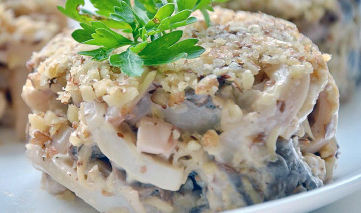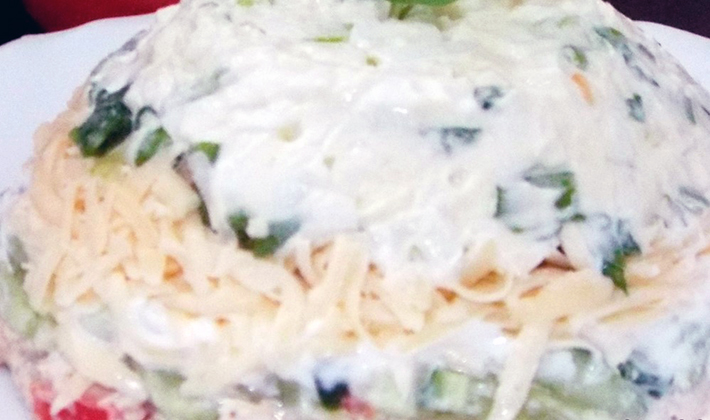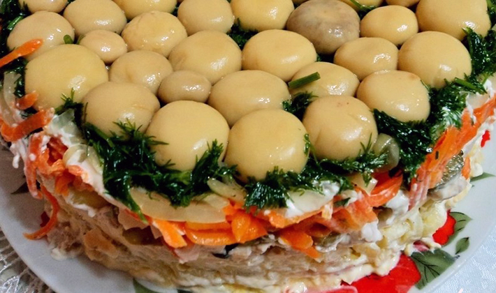 - Salade en couches avec des champignons en conserve et des saucisses