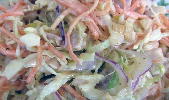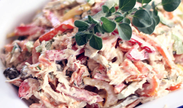 - Mélanger la mayonnaise avec du paprika et des herbes hachées, bien mélanger et assaisonner la salade.