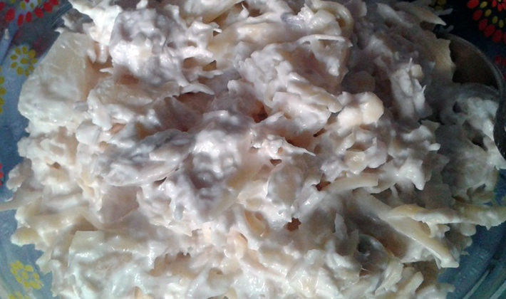- Mélanger, assaisonner avec de la mayonnaise, saler au goût, mélanger à nouveau.