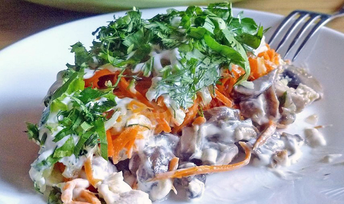 Une salade à base de champignons, de carottes et de poulet en conserve est un régal incroyablement délicieux pour un dîner en famille. Le plat plaira sûrement à tous les membres de votre famille, malgré la simplicité.