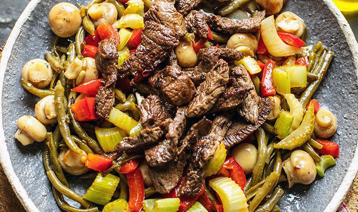 Salade aux champignons en conserve, boeuf et moutarde
