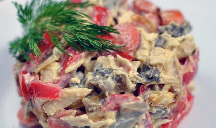 La salade, préparée avec des champignons et des tomates en conserve, décorera toute fête avec son goût et ses couleurs vives.