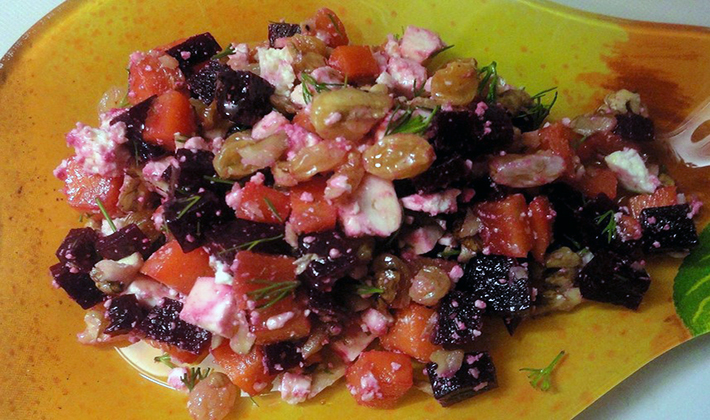 Cette version de la salade avec des champignons, des poivrons et des raisins secs en conserve hachés est proposée pour la cuisson des repas de fête. Le plat s'avère savoureux, copieux et parfumé, avec des notes aigres-douces.