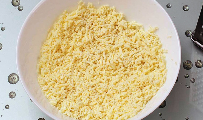 - Faire bouillir les œufs pendant 10 minutes, laisser refroidir, verser de l'eau froide, peler et râper sur une râpe fine.