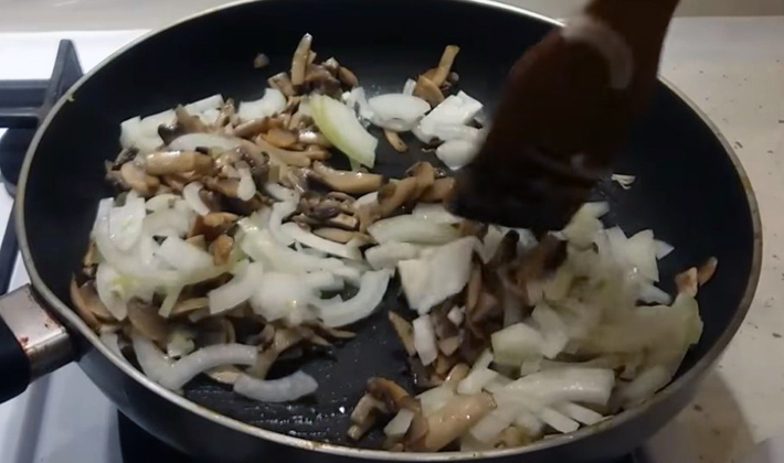 - Faire frire les oignons marinés, mélanger avec la viande, les champignons et les cornichons, mélanger.