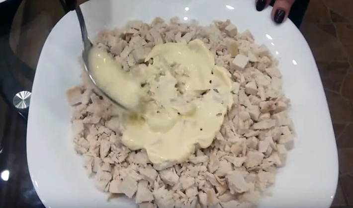 - Combinez tous les ingrédients préparés, remplissez de sauce mayonnaise, mélangez.