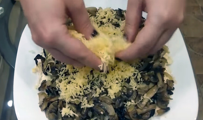 - Épluchez les œufs, hachez-les avec un couteau, râpez le fromage sur une râpe grossière, après l'avoir maintenu au congélateur pendant 15 à 20 minutes.