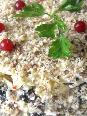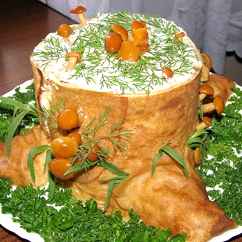 - Vous pouvez répéter les couches d'ingrédients, en les graissant avec de la mayonnaise, et mettre quelques champignons entiers dessus pour décorer et brancher du persil ou du basilic.