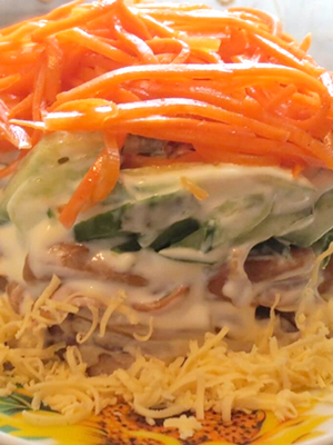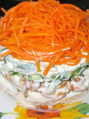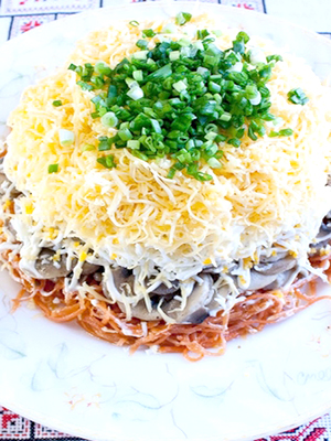- Tartinez les carottes râpées, badigeonnez-les de mayonnaise, puis ajoutez une couche de champignons et de mayonnaise, saupoudrez de fromage et décorez-le d'aneth haché.