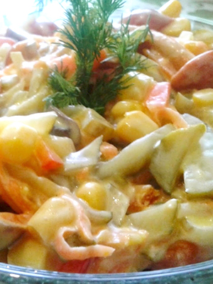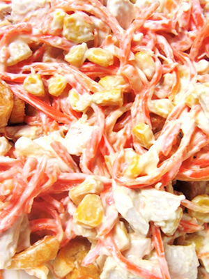 - Nous mettons tout ensemble, l'ajoutons au goût, introduisons le maïs égoutté et assaisonnons avec de la mayonnaise.