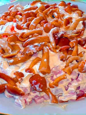Salade aux champignons marinés, étalée en couches et graissée de mayonnaise.