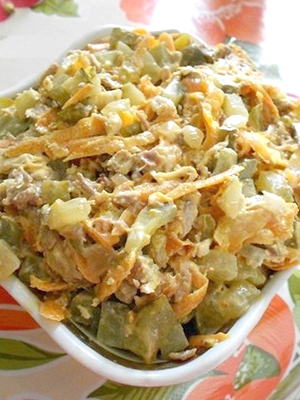 - Salade cuite avec des champignons marinés et des concombres frais