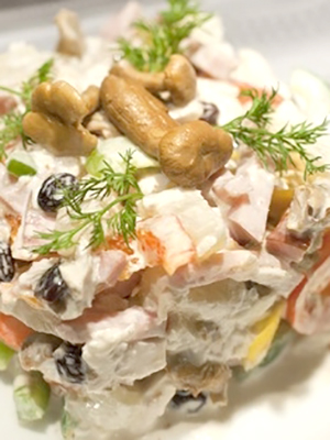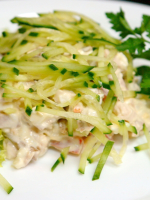 - Entrez dans la salade, mélangez doucement, mettez dans un saladier et servez.