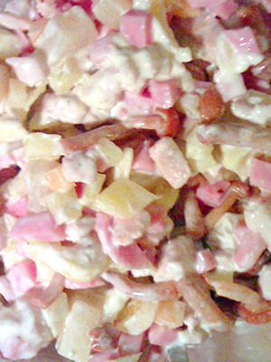 - Couper la poitrine fumée en tranches et mélanger avec le reste des ingrédients.