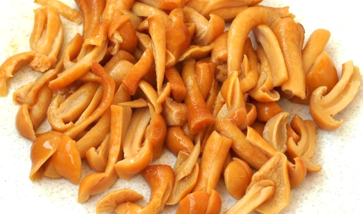 - Les champignons au miel marinés sont lavés à l’eau froide, coupés en petits cubes.