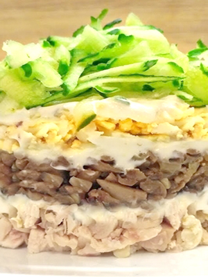 La salade faite de champignons marinés et de poulet fumé est destinée à un festin festif. Ce traitement est considéré comme faisant partie intégrante des vacances du Nouvel An.