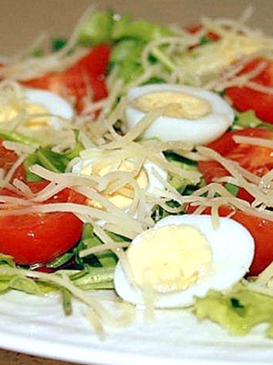 - Mettez dans un bol à salade, ajoutez les oeufs épluchés et coupés en dés.