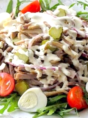 - Salade avec langue, cornichons et couches de champignons marinés