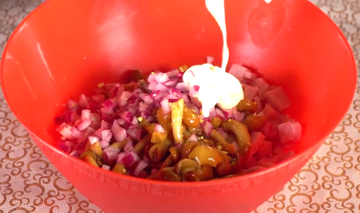 - Mélanger les oignons et les poivrons avec les champignons et les œufs, saler, mélanger la mayonnaise et la moutarde, battre.