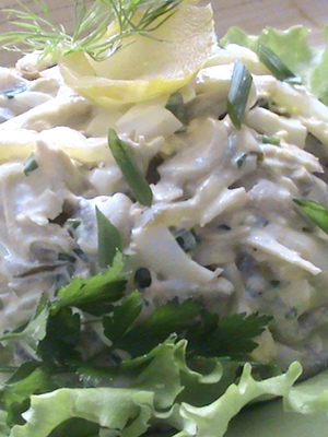 - Saler au goût, ajouter la mayonnaise, mélanger doucement et mettre dans un plat approprié.