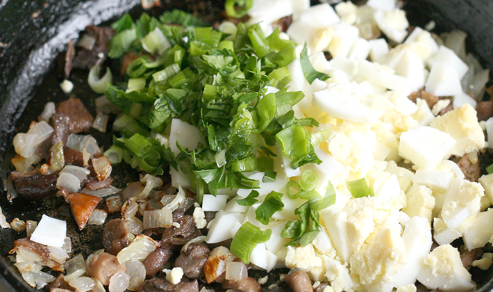 Mélanger les champignons avec les oignons et les herbes hachées.