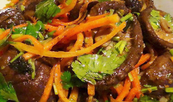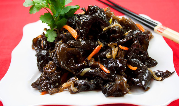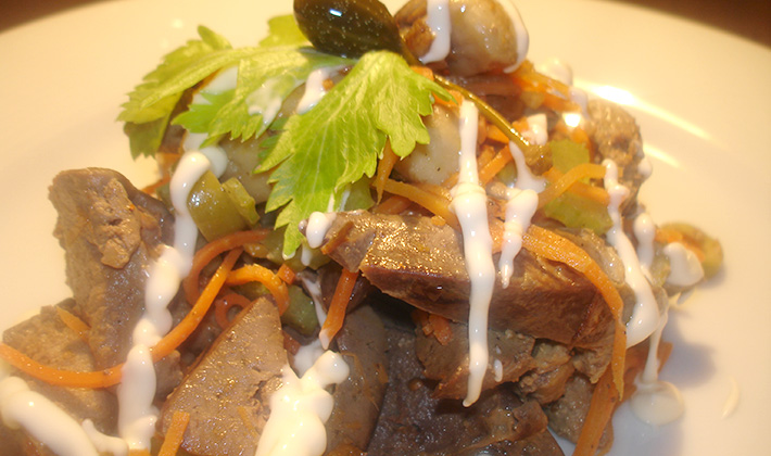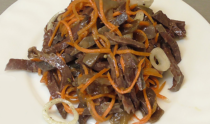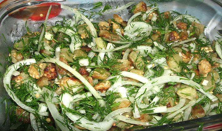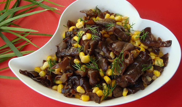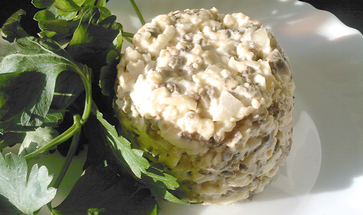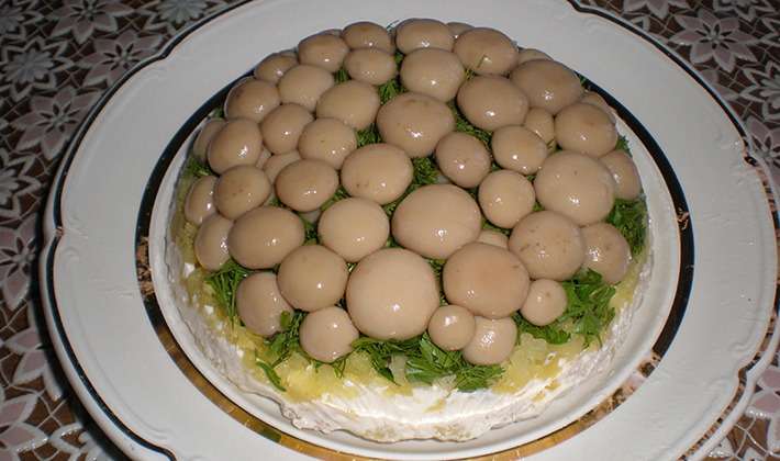 Les champignons salés sont trempés dans de l’eau froide, coupés en tranches, combinés avec des oignons émincés et une vinaigrette. Empilés dans un bol à salade, saupoudrés d'herbes finement hachées.
