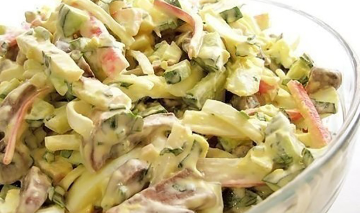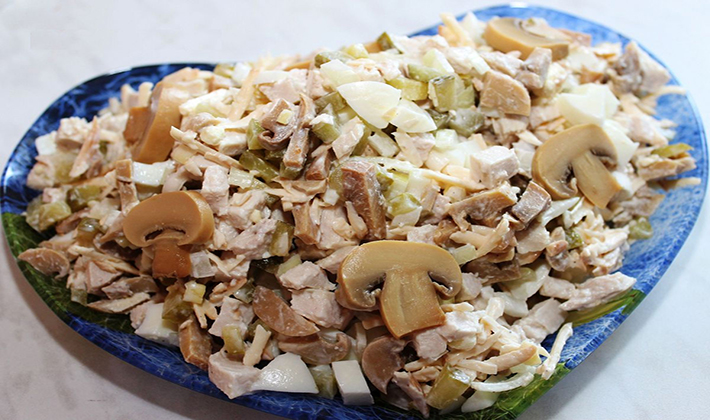 Faire bouillir les champignons frais, la viande de poulet, les racines de céleri et les couper en lanières. Couper les cornichons et les tomates en tranches, râper le fromage sur une râpe fine. Mélangez le tout avec de la mayonnaise, salez au goût et décorez avec des tranches de tomate.