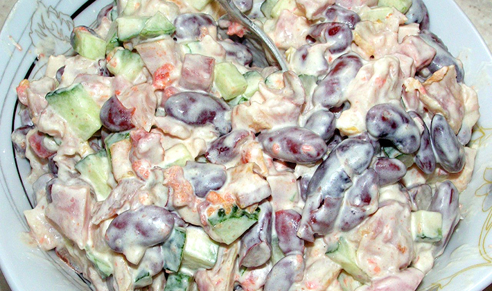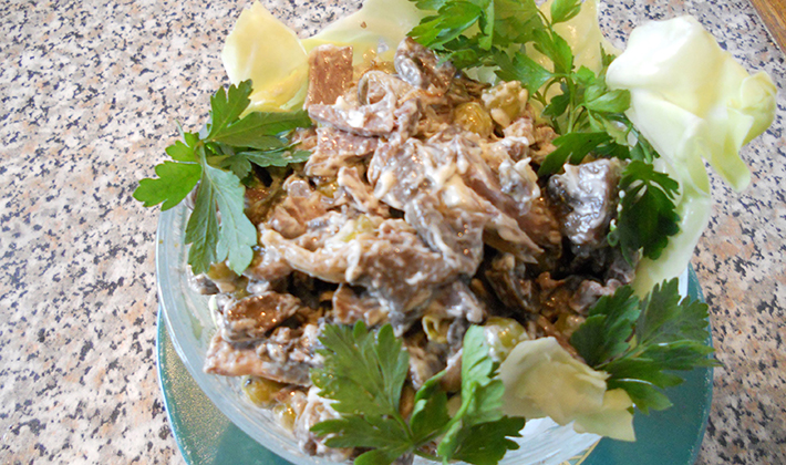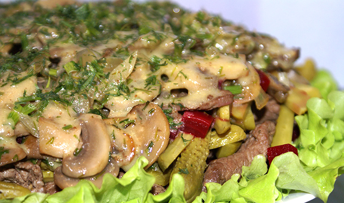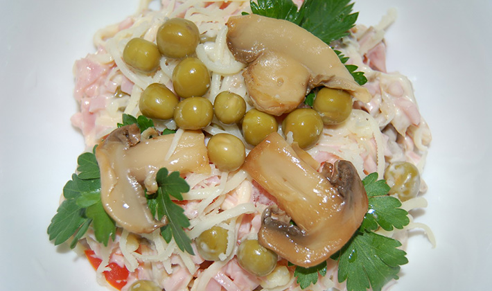 Faites bouillir la viande dans de l'eau salée avec des épices, coupée en cubes. Râpez le fromage. Hacher finement les champignons marinés. Mélangez le tout, ajoutez les pois verts, le sel, assaisonnez avec un mélange de crème sure et de raifort râpé. Décorer la salade finie avec des herbes.
