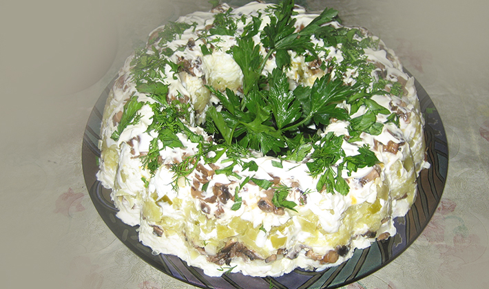 Les champignons sont lavés. Les pommes de terre en chemise sont pelées et hachées. Les oignons sont pelés, lavés et finement hachés. La choucroute est coupée en pressant la saumure. Tous arrosés avec de l'huile et du vinaigre, saler, poivrer et mélanger. Ils la mettent dans une glissière sur un plat, décorer avec des tranches de cornichons, des chapeaux de champignons et de l'aneth et du persil finement hachés.