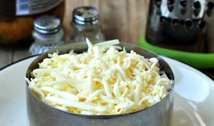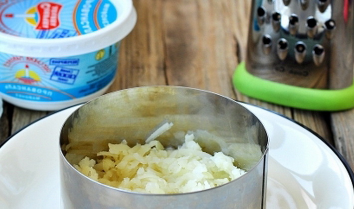 Saupoudrer les champignons avec les oignons émincés et étendre les pommes de terre râpées sur une râpe grossière, les lubrifier avec une couche de mayonnaise et parsemer du fromage fondu râpé sur la râpe.