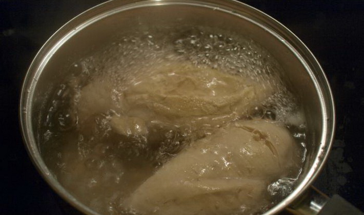Faites bouillir le filet de poulet dans de l'eau salée avec l'ajout de vos épices préférées et laissez-le refroidir dans le bouillon.
