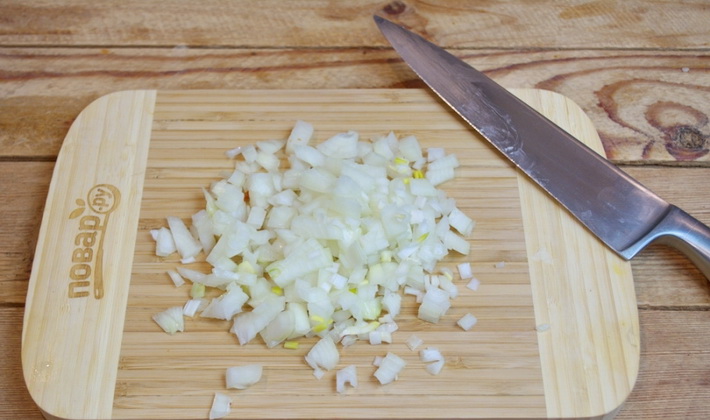 Broyez les oignons et les olives en petits cubes, en plaçant le tout dans des assiettes séparées.