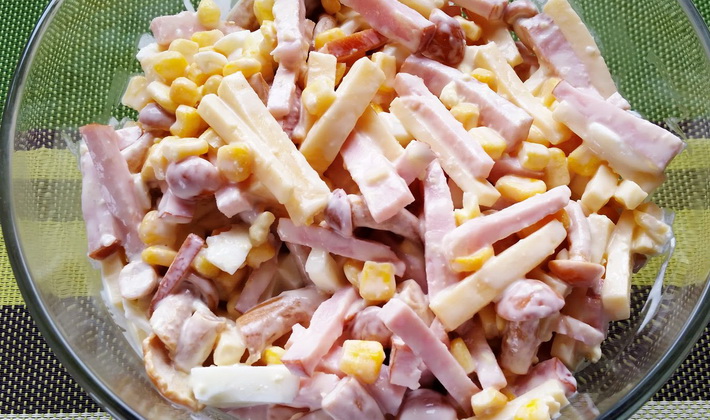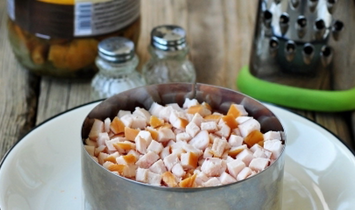 - Les ingrédients préparés sont disposés en couches sur un grand plat plat, chacun enduit de mayonnaise. Couches: champignons marinés, oignons émincés, pommes de terre râpées, jambon, œufs, encore des champignons marinés.
