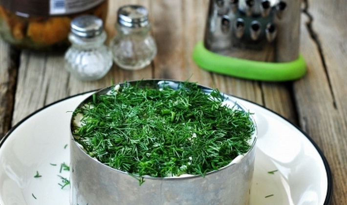 - Rincez les champignons marinés dans de l’eau et laissez-les sécher un peu. Mettez une partie sur l'aneth, laissez la seconde pour la couche supérieure.