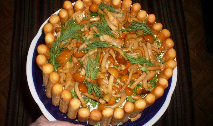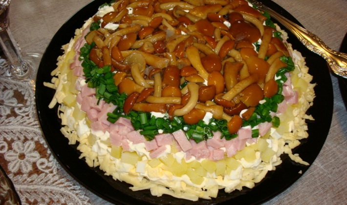 La salade "corbeille de champignons" aux champignons au miel est devenue traditionnelle avec "Olivier" et "Mimosa". Nous proposons de cuisiner ce plat qui peut vous surprendre par son goût.