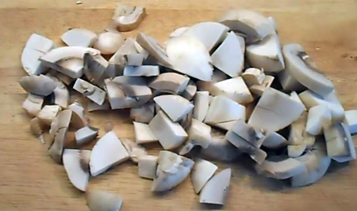 - Rincer les champignons sous le robinet, mettre dans une passoire, égoutter le liquide en excès, sécher, étendre sur une serviette en papier et couper en petits cubes.