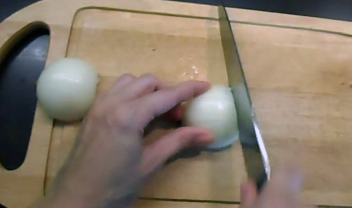 Épluchez l'oignon, coupez-le en quatre et ajoutez un mélange d'eau et de vinaigre, mélangez et laissez reposer 20 minutes.