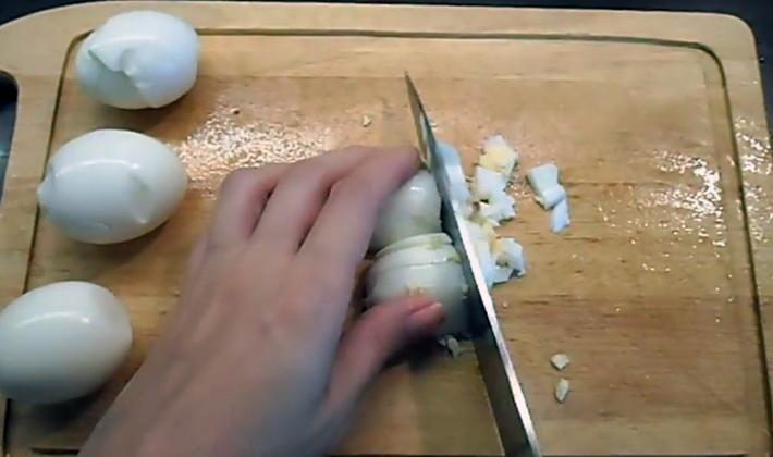 - Faites bouillir les œufs durs, laissez-les refroidir, épluchez-les et coupez-les en cubes (laissez 3 œufs intacts).