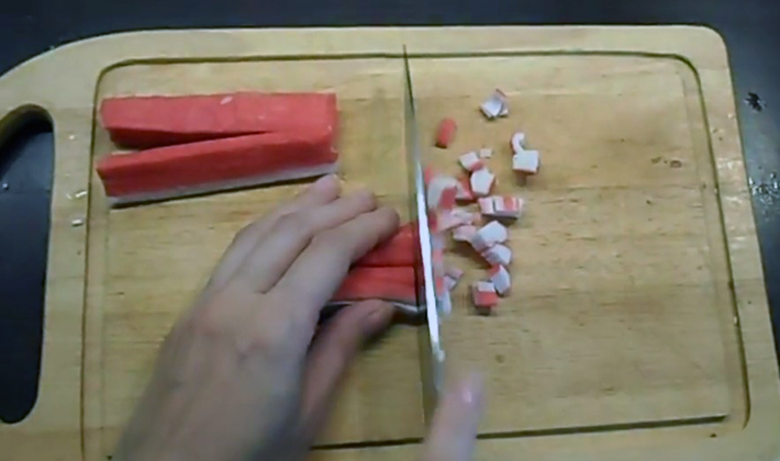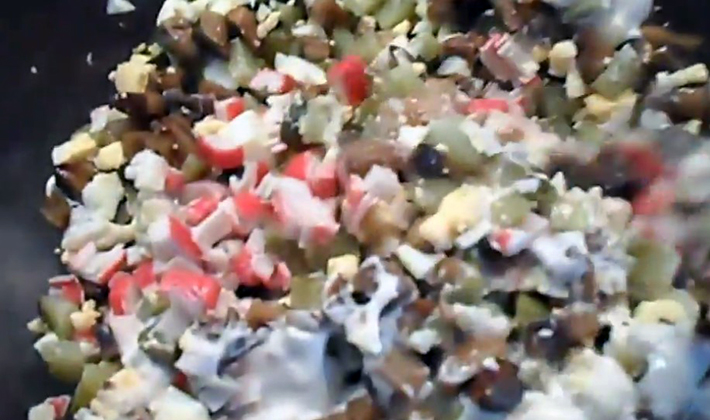- Couper les bâtonnets de crabe, les concombres, mélanger tous les ingrédients dans un récipient.