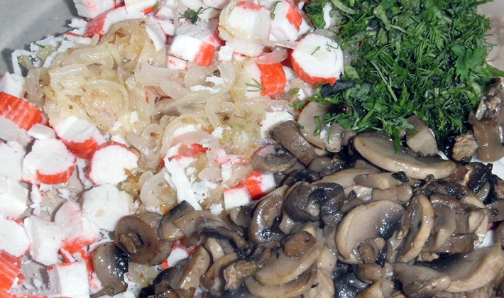 - Les champignons sont broyés en cubes ou en paille, les bâtonnets de crabe en cercles.