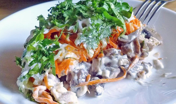 Cette salade, cuite avec des bâtonnets de crabe et des champignons sautés, ne manquera pas de plaire à votre famille et à vos invités. Les amateurs de goûters aux champignons se souviendront longtemps de son goût et de son arôme.