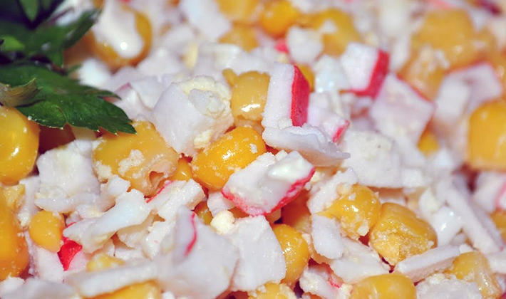 - Salade aux bâtonnets de crabe, champignons, oignons verts et maïs