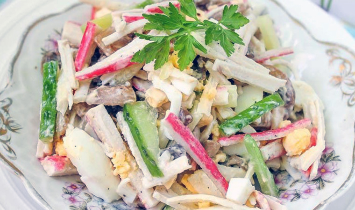 - Salade simple aux champignons, bâtonnets de crabe et concombres