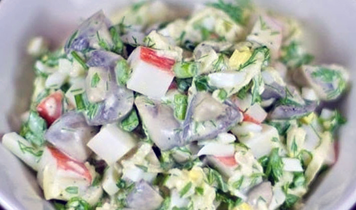 - Salade Alyonka avec des bâtonnets de crabe, des oignons et des champignons marinés