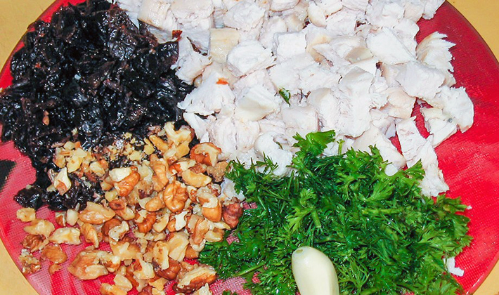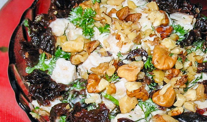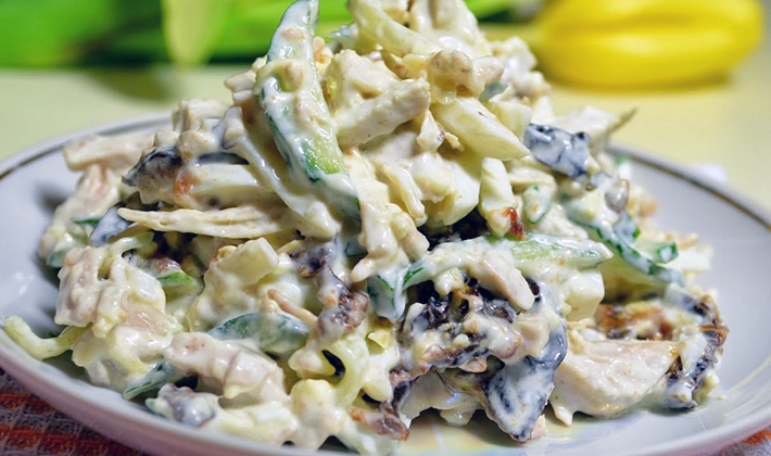 - Salade aux champignons, poitrine de poulet bouillie, oignons et pruneaux