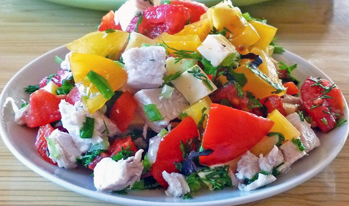 - Salade de poitrine de poulet, champignons, œufs et tomates
