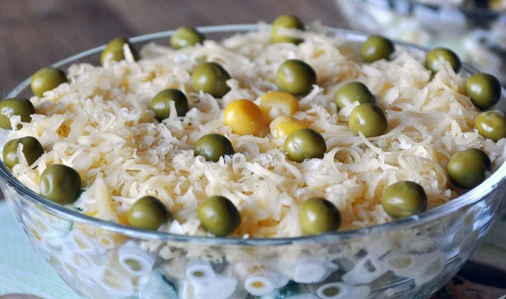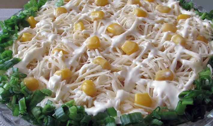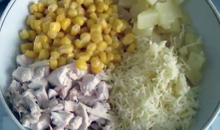 - Égoutter le maïs, mélanger avec la salade, assaisonner avec de la mayonnaise et bien mélanger.